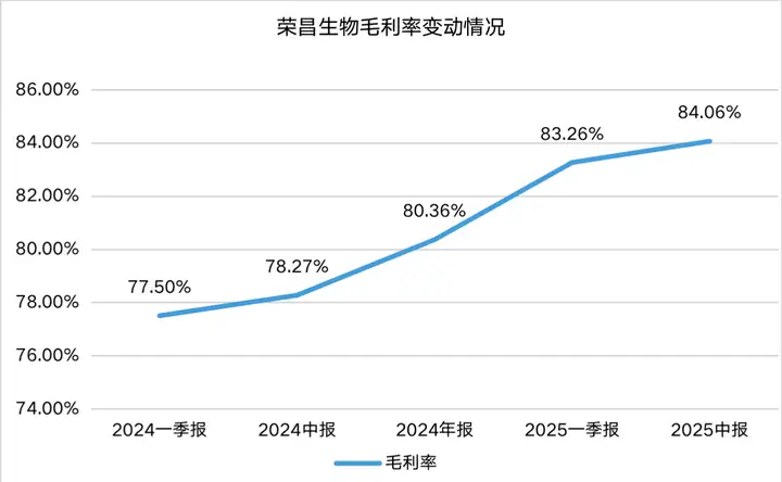 隨着收入的持續增長,榮昌生物的盈利能力也不斷得到增強。一個關鍵指標是毛利率的持續攀升,從2024年一季度的77.5%提升至當前的84.06%。這反映出公司已經度過市場導入期,規模效應開始顯現。