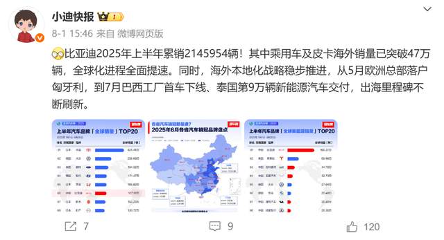 當國內公務車市場塵埃落定,比亞迪的野心已投向全球。2025年上半年,其海外銷量超47萬輛,同比激增132%,遠超2024年全年總量。從亞洲到歐洲,從拉美到非洲,比亞迪正以“技術輸出+本土化”策略,重塑全球汽車產業格局。