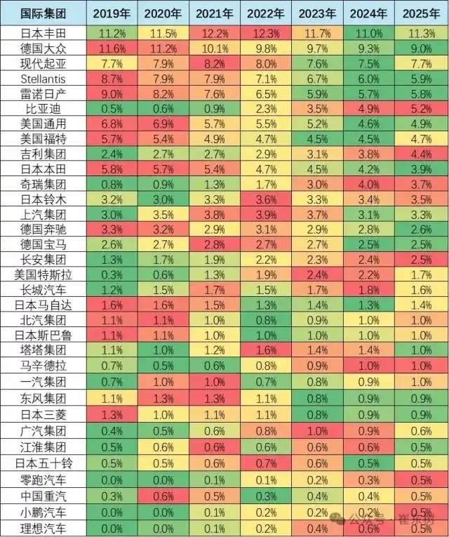 根據乘聯會發布的數據,比亞迪以 5.2% 的市佔率,首次超越百年車企通用,並首次擠入全球車企排名前五。從數據來看,比亞迪的市佔率在五年內飆升逾十倍,從 2019 年的 0.5% 急速攀升至 2025 年預計的 5.2%。