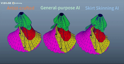 在蒙皮方面,騰訊遊戲VISVISE推出GoSkinning蒙皮工具,通過兩階段AI解決蒙皮難題:先由通用蒙皮AI大模型(基於GCN和Transformer架構)預測骨鏈、骨骼的權重,再通過局部AI對效果不佳區域(如裙襬、翅膀等複雜部件)進行二次優化。