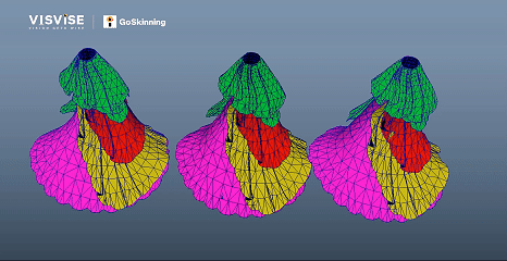 局部蒙皮方面,下面這個例子可以看到角色裙襬出現了粘連問題,在場景中只需選出錯誤的關節和頂點,然後就能讓GoSkinning針對局部一鍵自動修復: