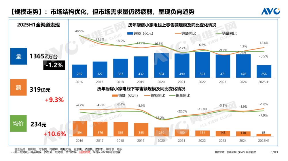 小家電價格降了這麼多,銷量卻沒見往上漲。奧維雲網最新的半年數據顯示,2025 年上半年小家電整體零售量13652萬台,同比下降1.2%。另外據奧維雲網此前數據,2023年廚房小家電市場整體零售額約為549.3億元,同比下降9.6%;零售量約為2.65億台,同比下降1.8%。2024年“618”促銷期,廚房小家電全品類線上渠道(傳統電商+抖音)零售額為32.8億元,同比下降10.3%。