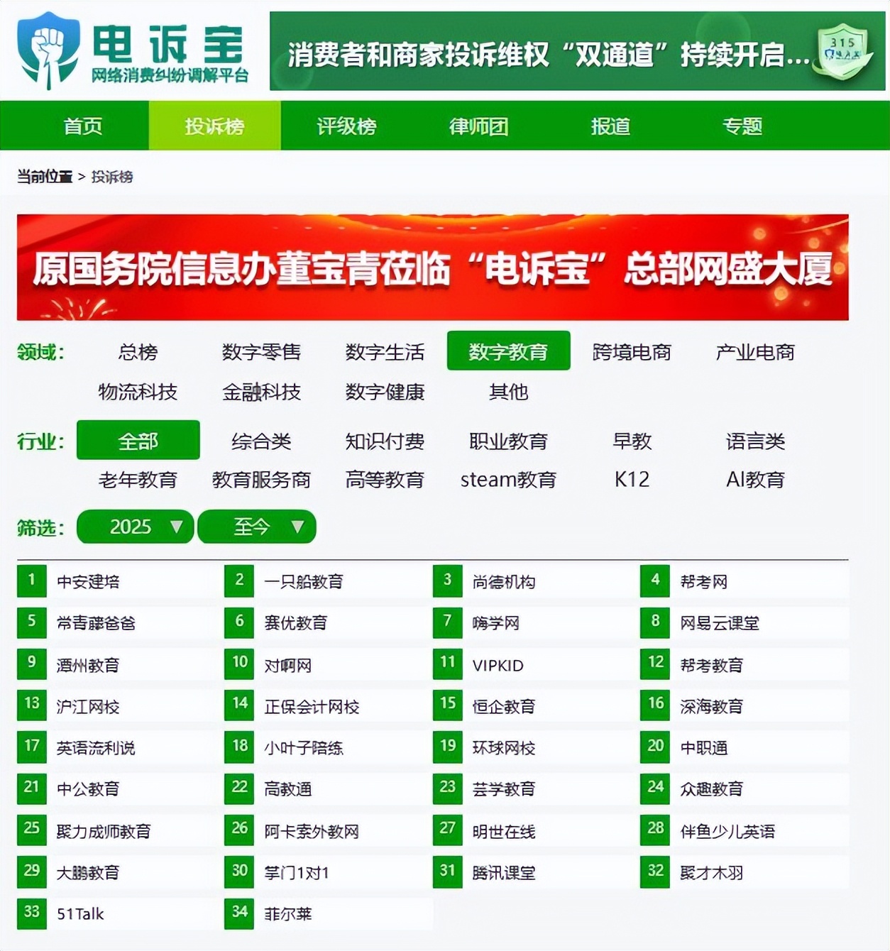 根據“電訴寶”2023年至今受理的職業教育領域用户有效投訴顯示(依據投訴量排行),嗨學網排名第7位,最新評級為**“不建議下單”**。其他被投訴的類似平台依次為:一隻船教育、學慧網、興為教育、幫考網、潭州教育、中職通、尚德機構、深海教育、大鵬教育、對啊網、中安建培、聚師網、恆企教育、賽優教育、中公教育、芸學教育、高頓教育、十方教育、聚力成師教育、幫考教育、平安好學、神州國開教育、升學教育、思鴻網校、師大教育、天普教育、中安建培教育、鴻博教育等。