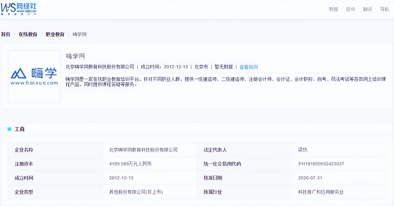 據網經社企業庫顯示,“嗨學網”隸屬於北京嗨學網教育科技股份有限公司,成立於2012年12月,法定代表人梁熱。