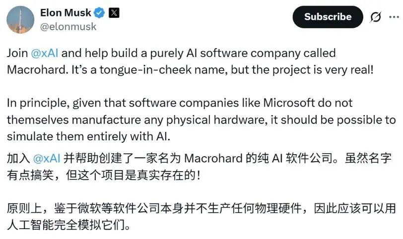 馬斯克會用類似行為藝術的方式,直接對其進行降維打擊,他成立了一家名為“Macrohard”(巨硬)的新公司,並向美國專利商標局提交了商標申請。