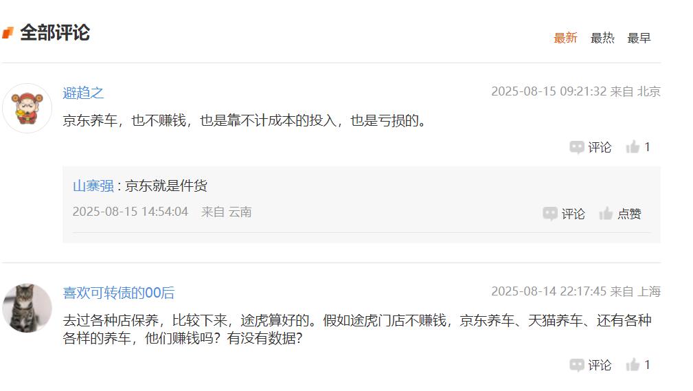 網友“喜歡可轉債的00後”評論道:“去過各種店保養,比較下來,途虎算好的。假如途虎門店不賺錢,京東養車、天貓養車,還有各種各樣的養車,他們賺錢嗎?有沒有數據?”