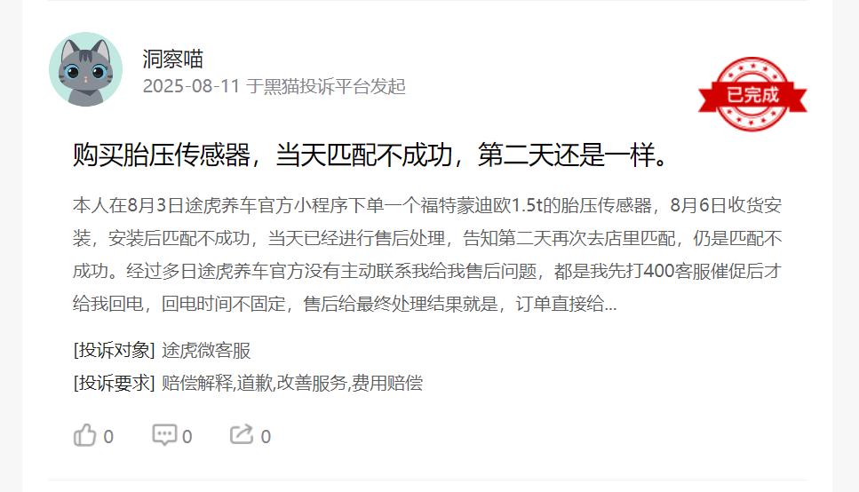 還有網友投訴購買胎壓傳感器,當天匹配不成功,第二天還是一樣,售後處理也不及時。這些投訴反映出加盟商盈利困境下,消費者權益難以得到保障,讓消費者對途虎養車的信任大打折扣。
