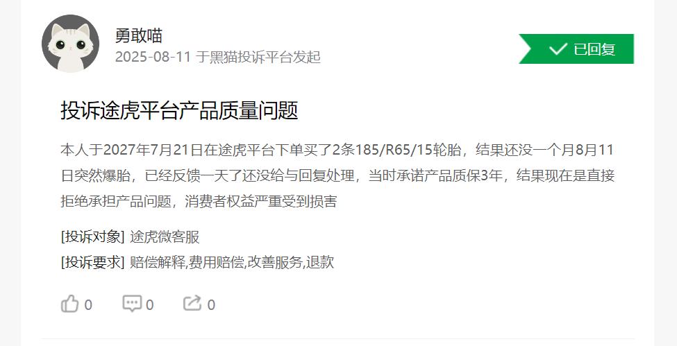 網友于2025年8月11日在黑貓投訴平台發起投訴,稱自己在2027年7月21日在途虎平台下單買了2條輪胎,結果還沒一個月8月11日突然爆胎,反饋一天了還沒得到回覆處理,當時承諾產品質保3年,現在卻直接拒絕承擔產品問題,消費者權益嚴重受到損害。