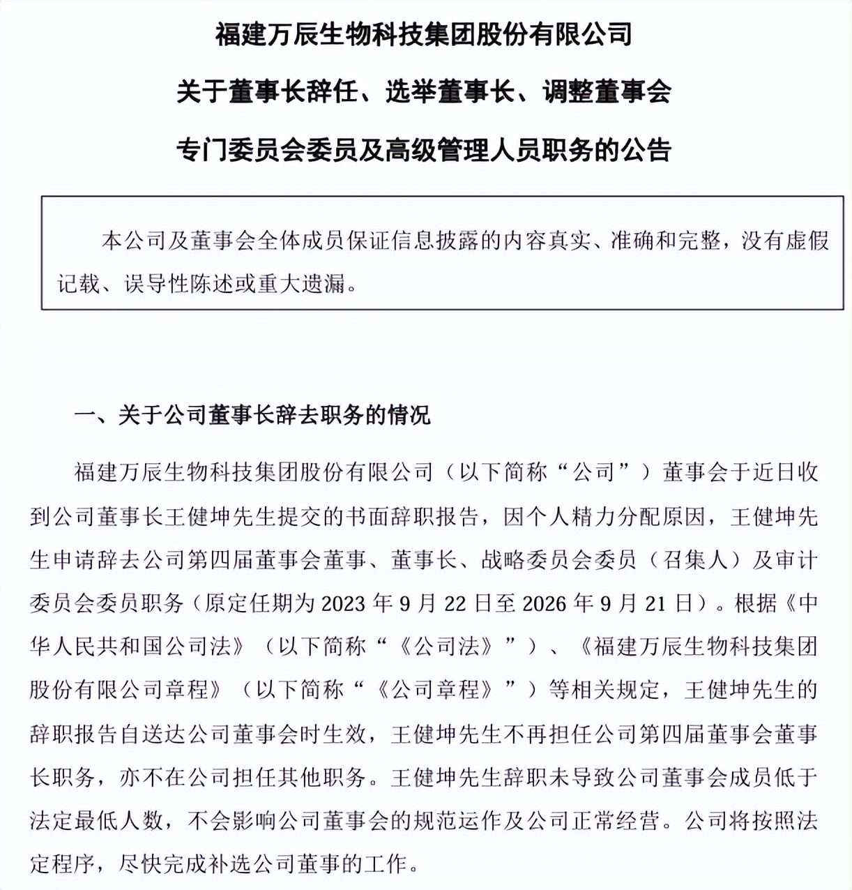 值得注意的是,一個月前,萬辰集團剛經歷重大人事變動。7月25日公告顯示,公司創始人王健坤辭去董事長職務,由其姐、原總經理王麗卿接任,同時王健坤之子王澤寧出任總經理,後者也是公司實控人。而在此之前,王健坤曾被留置並立案調查兩個多月之久,直至5月26日才恢復正常履職。