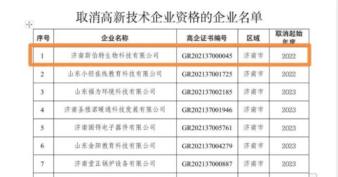 近期,山東省科技廳在其官方網站發佈名為《關於取消濟南斯伯特生物科技有限公司等149家企業高新技術企業資格的通知》通知(下稱“通知”),濟南斯伯特生物科技公司(下稱“濟南斯伯特”)位列該榜單首位,被取消“高新技術”企業資格。