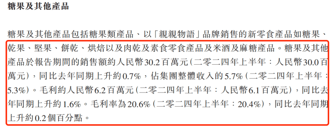 2025年上半年,糖果及其他產品的收入同比上升約0.7%,毛利較去年同期增長約1.6%,增長緩慢。