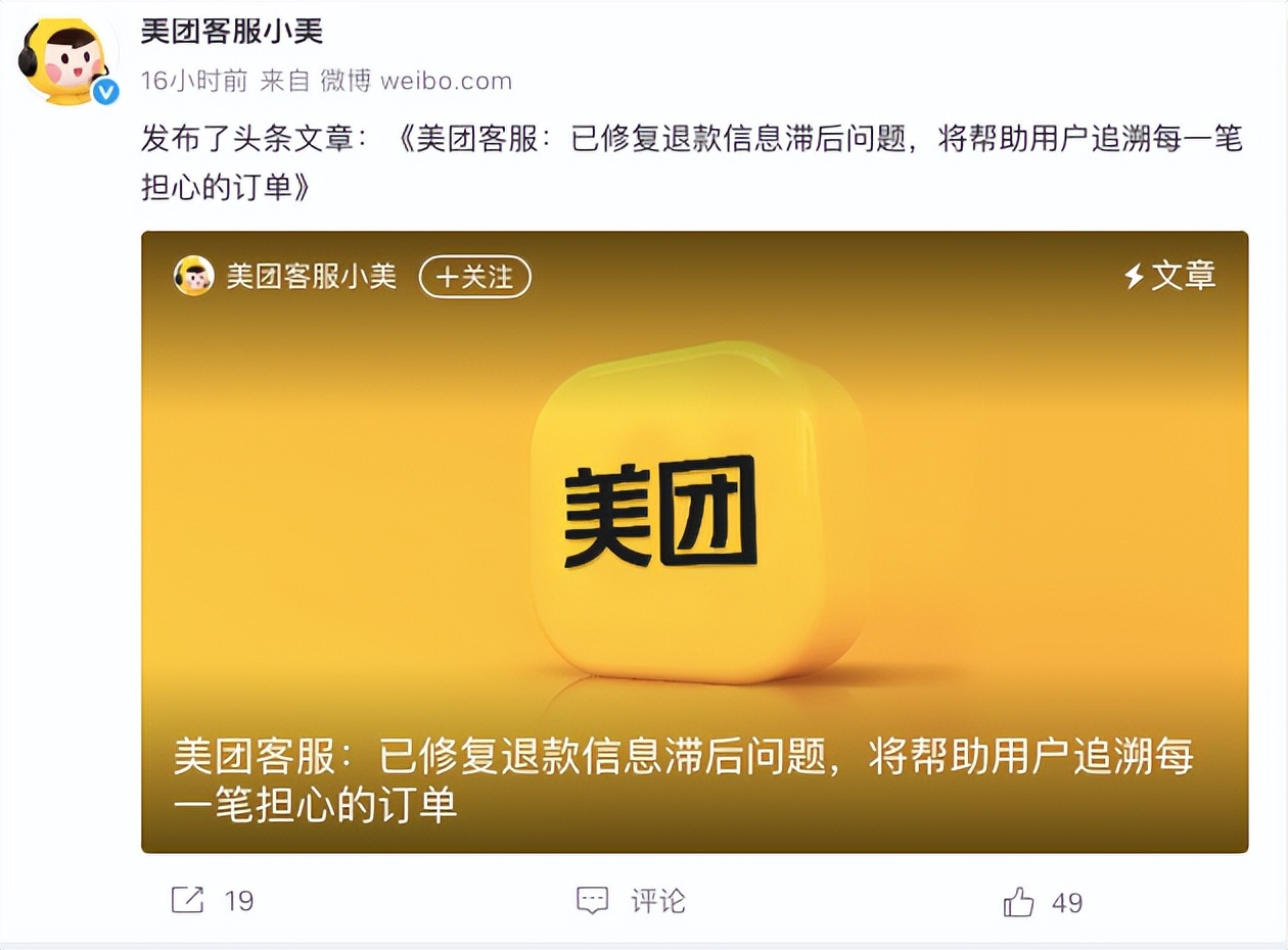 在這次回應中,美團把原因歸結到“技術優化未到位”,絕大多數“退款未到賬”情況實為“信息展示滯後”所致。