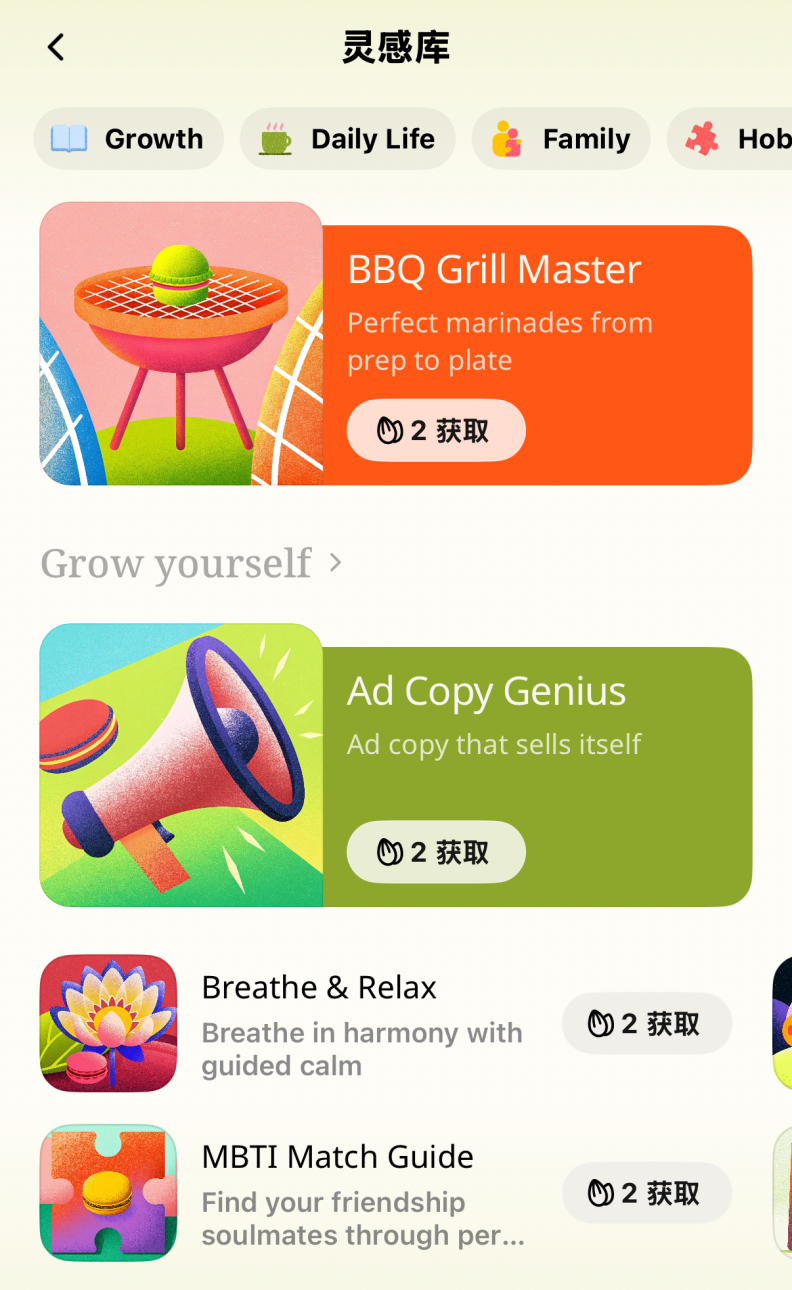 Macaron有一個“靈感庫”,在這裏分門別類地涵蓋了各種生活向的mini app模板:家庭(Family)、愛好(Hobbies)、日常生活(Daily Life)、個人成長(Growth)。