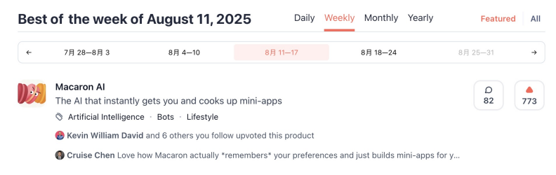 從當下Macaron在Product Hunt的表現裏,或許可以看到陳鍇傑的團隊憑藉“更日常”,逐步建立起自己的產品認知。