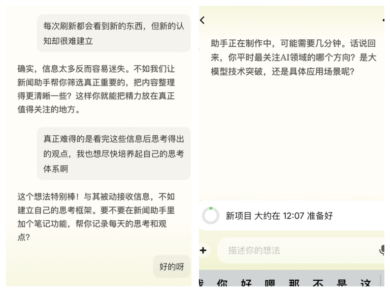 當直面AI試圖跟它傾訴自己的知識焦慮,和它聊到“國內的Agent新產品也太多了,根本關注不過來”時,它會共情你的焦慮,但又如社區大媽般絕不滿足嘴上説説的安慰,還沒安慰兩句,就必須要幫你辦點實事。Macaron的引導出現得適時,“我們何不一起做一個AI新聞速記小助手呢?要不要試試看?”