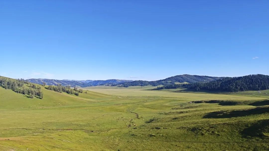 沒有遮攔的視野裏,草甸隨地形起伏成温柔的浪,針葉林在浪尖上站成筆挺的林帶,遠處的山影淡成青灰色的輪廓,與流雲纏繞着、推搡着,把天地的邊界拉得無限遠。