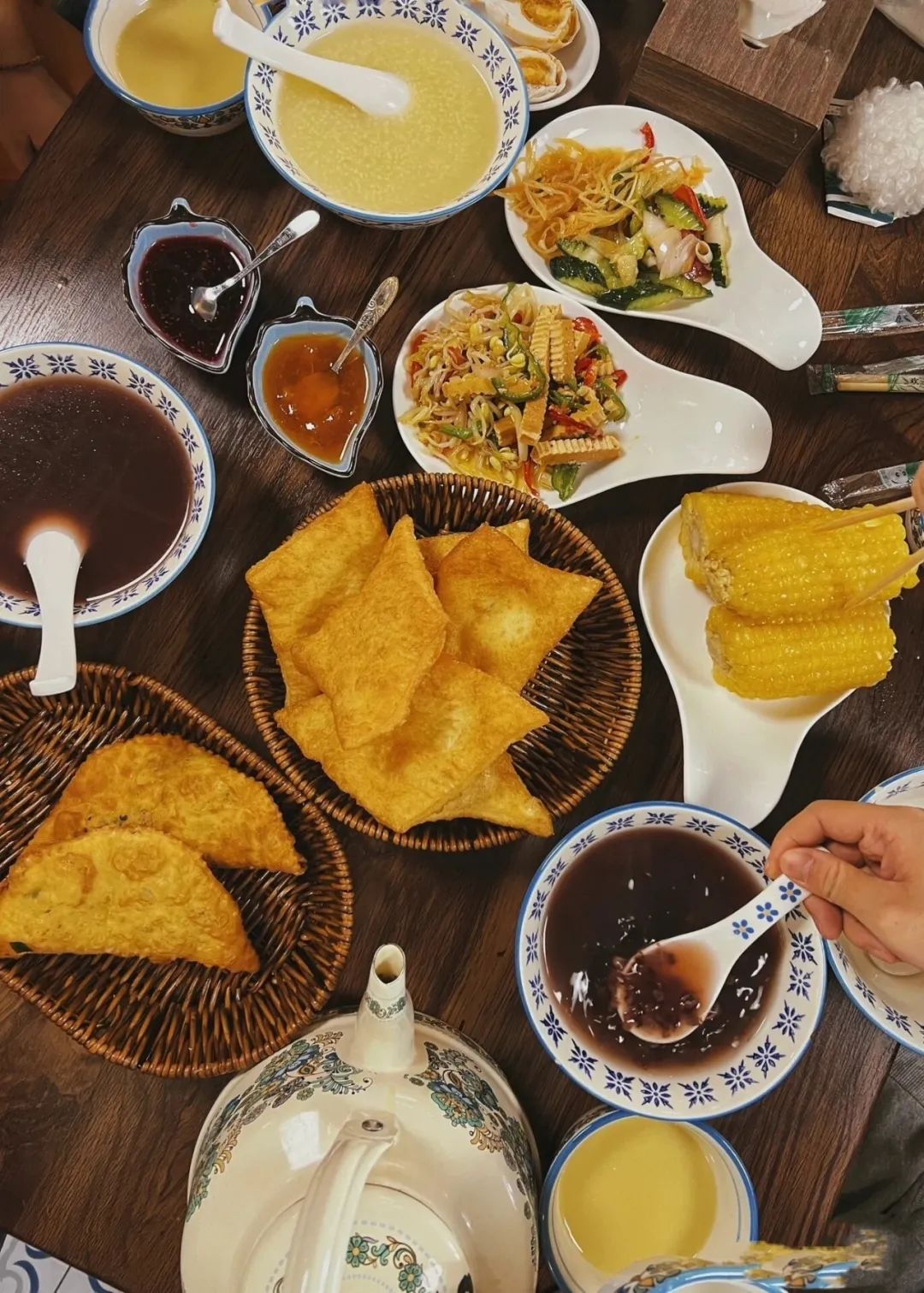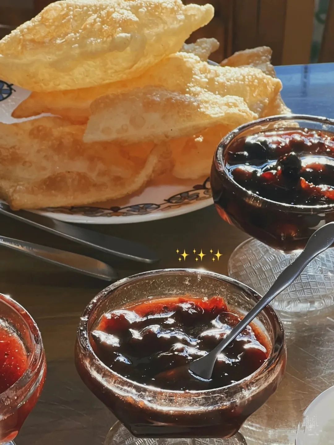 開胃小菜率先激活味蕾,油香酥脆的包爾薩克肚子裏或是裝滿小菜,或是抹滿果醬,咬上一口,存齒留香,一口混着奶皮子、塔爾米、酥油的鹹奶茶順着食道滑進肚中,這頓早飯,吃的攢勁兒。