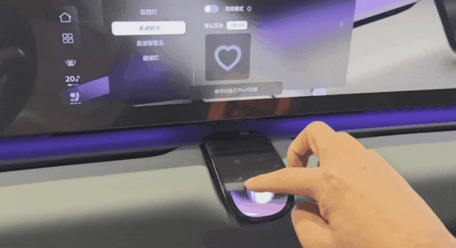 而中控上的氛圍燈打在超纖皮上,得把控一個合適的距離,避免被皮料把燈光 “吸” 完了。