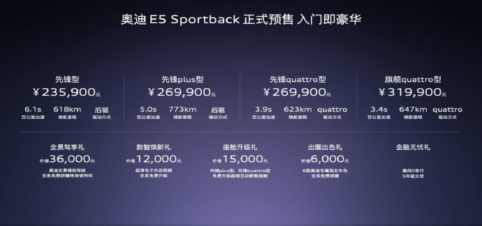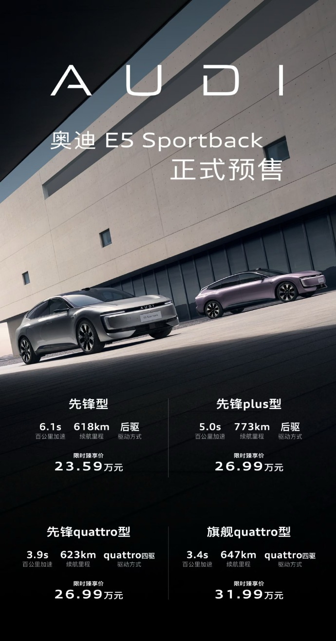 前幾天,奧迪 E5 Sportback 正式開始預售,23.59 的入門價,第一次見到 BBA 的初始價格能跟新勢力掰手腕的。
