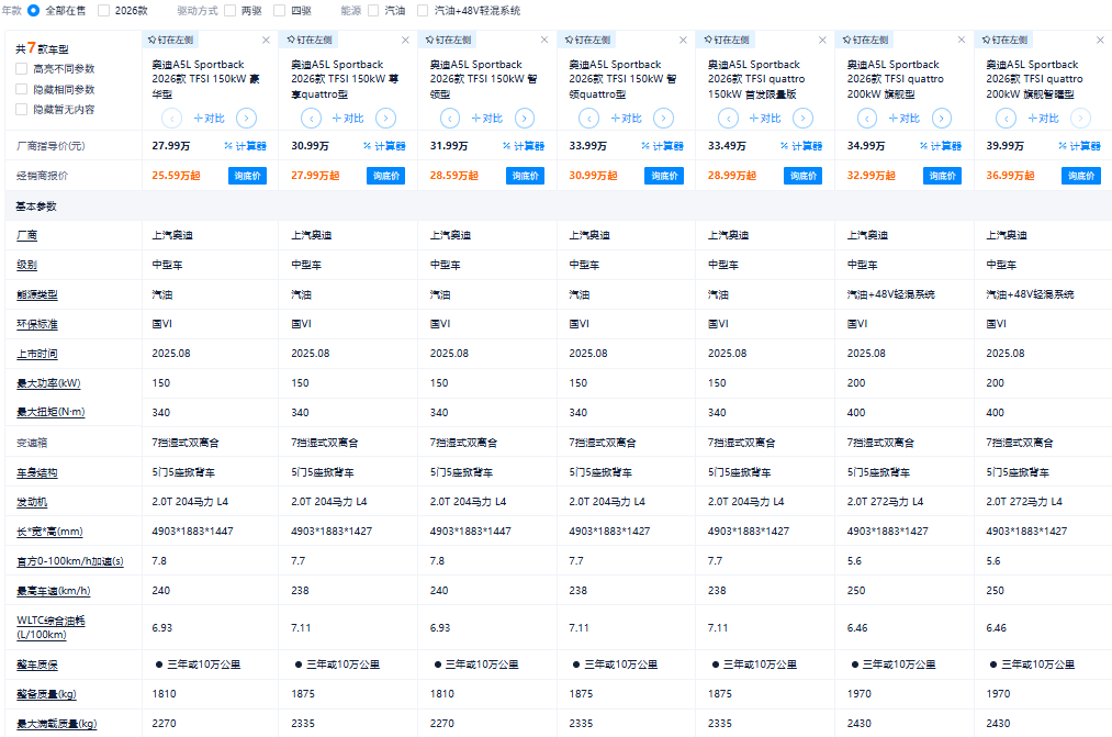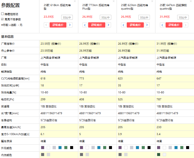 至於版本之間的配置差異,奧迪還沒透露,但是第三方平台已經有配置表了。