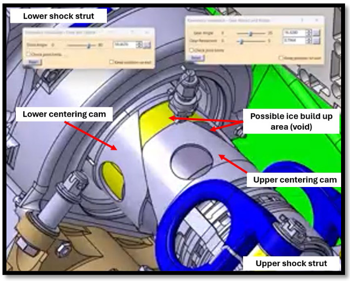 “前起落架居中凸輪用於確保前起落架正確居中。一個凸輪安裝在起落架支柱頂部,另一個安裝在起落架支柱底部。”報告補充道,“事故飛行開始時,由於前起落架支柱內部結冰,前起落架未能完全伸展。結冰是由於用於維護支柱的液壓油中混入大量水分,以及艾爾森空軍基地周圍環境温度過低共同造成的(附錄J-189)。未完全伸展導致錯位,使得前起落架上鎖鈎無法鈎住前起落架上鎖滾輪,造成滾輪相鄰金屬損壞。”