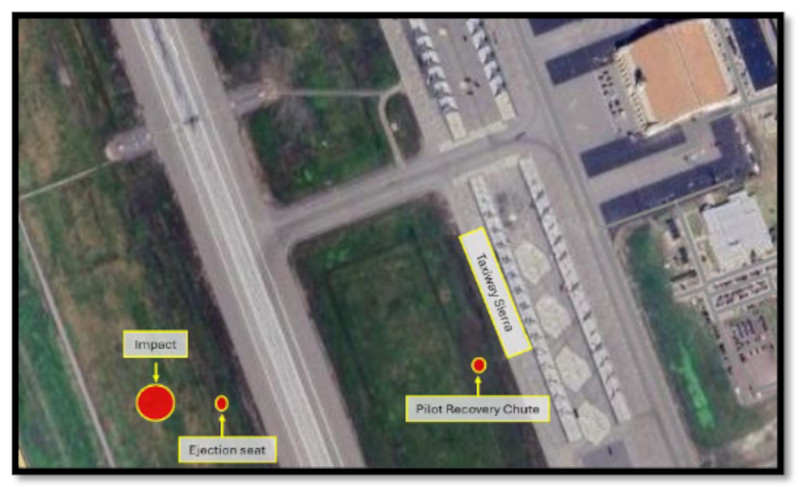 另一張衞星標註圖則顯示了飛行員和彈射座椅的墜落位置與F-35A戰機撞擊地面的位置。美國空軍