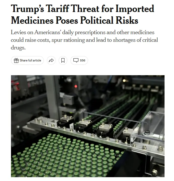 紐約時報報道,特朗普對進口藥品徵收關税或將導致美國人面臨更高的藥品價格和關鍵藥品的短缺