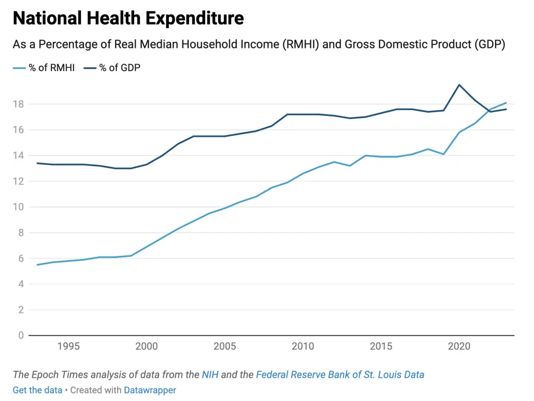 美國醫療支出佔中位數家庭收入和佔國內生產總值百分比