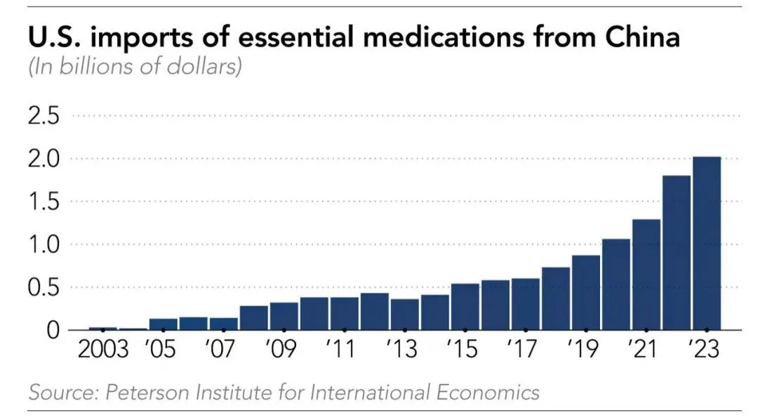 短缺的另一面,是對進口的嚴重依賴。2025年美國藥學會數據顯示:美國91%的仿製藥依賴進口,其中60%以上的原料藥(API)來自中國;45%的製藥關鍵起始原料(KSM)依賴中國供應。