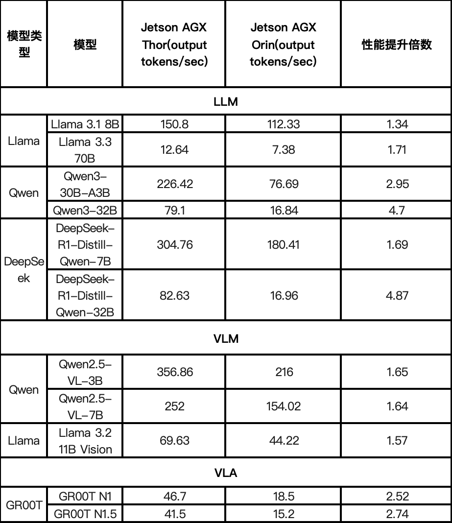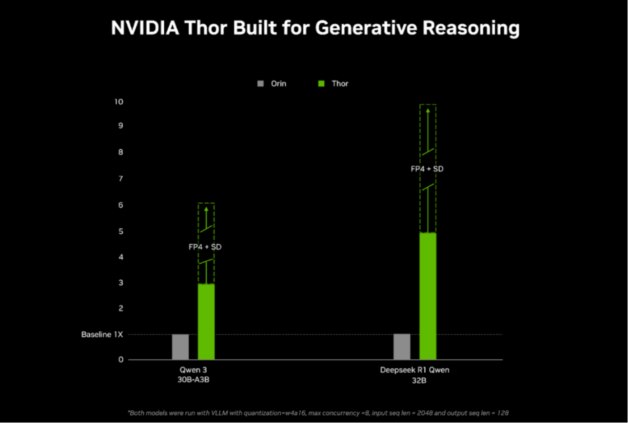 在生成式推理方面,Jetson Thor速度較Jetson Orin最高提升至5倍