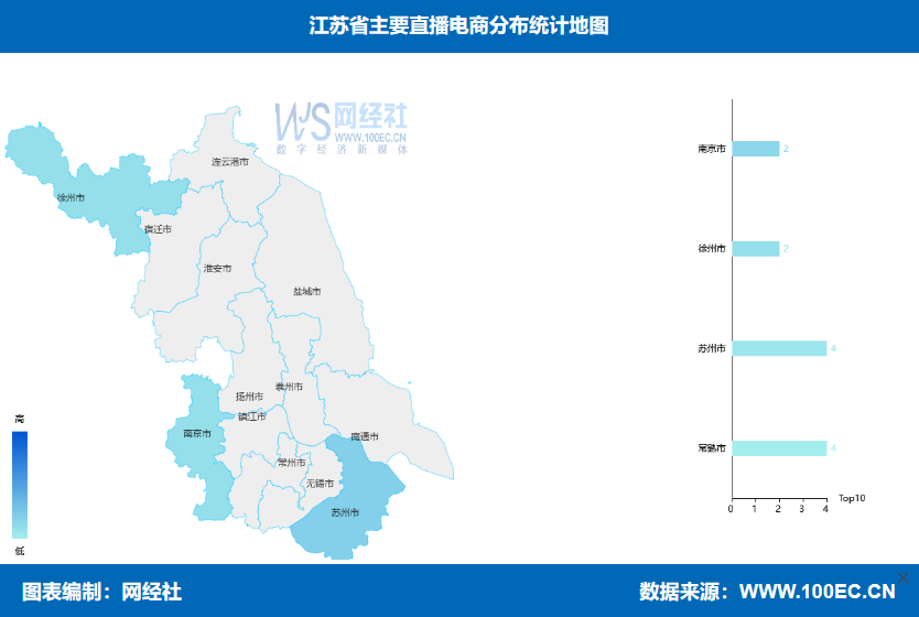 網經社企業庫數據顯示,收錄的江蘇省規上直播電商公司主要分佈在南京市、徐州市、蘇州市、常熟市等地區,其中南京2家、徐州2家、蘇州4家、常熟4家。