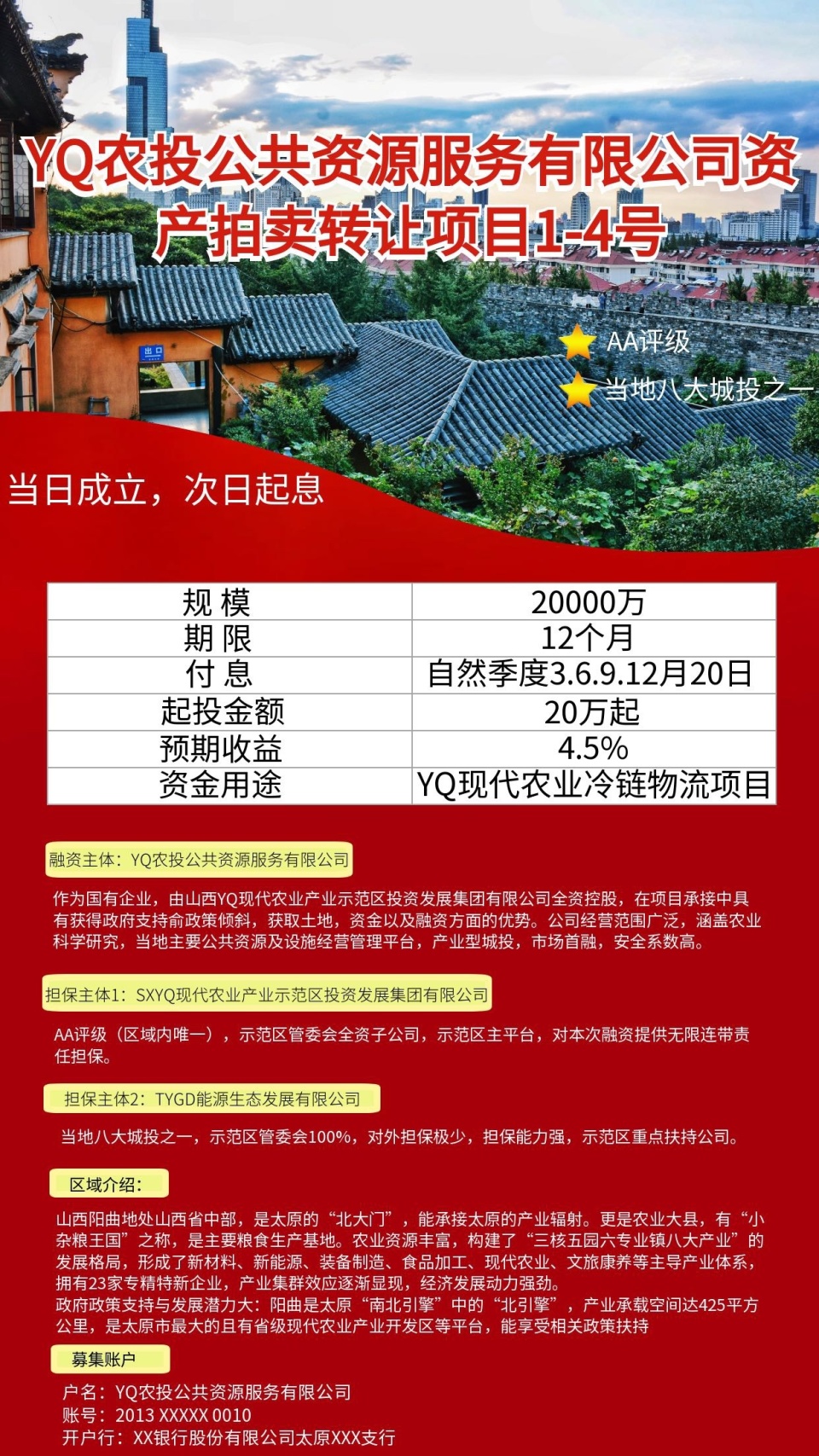 陽曲農投公共資源服務有限公司(以下簡稱“陽曲農投”)日前通過拍賣機構,將其持有的債權資產拆分為標準化小份額,以“資產拍賣轉讓項目1-4號”名義面向公眾投資者進行掛牌融資,總規模達2億元人民幣。