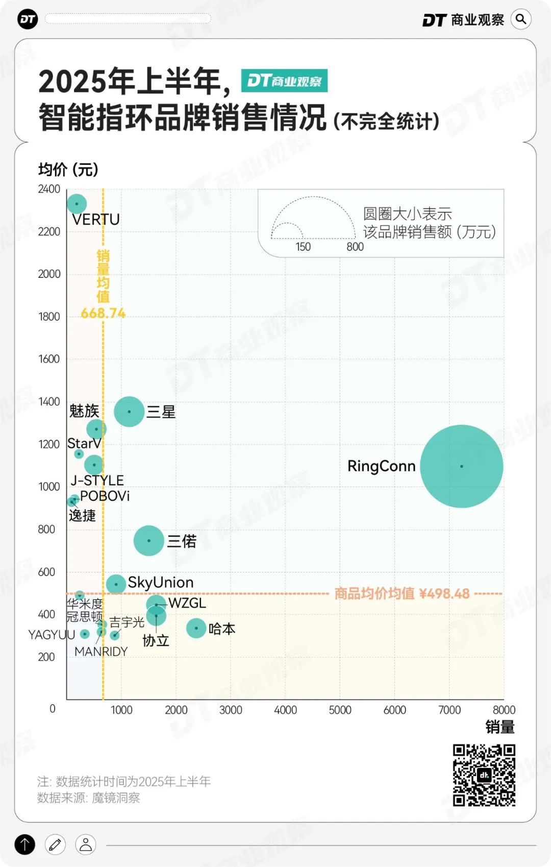 國內市場同樣如此,2025年上半年主要電商平台數據顯示,智能指環的市場份額在手環、手錶、指環三大品類中僅佔0.1%,但銷售額同比增幅達到6401.7%