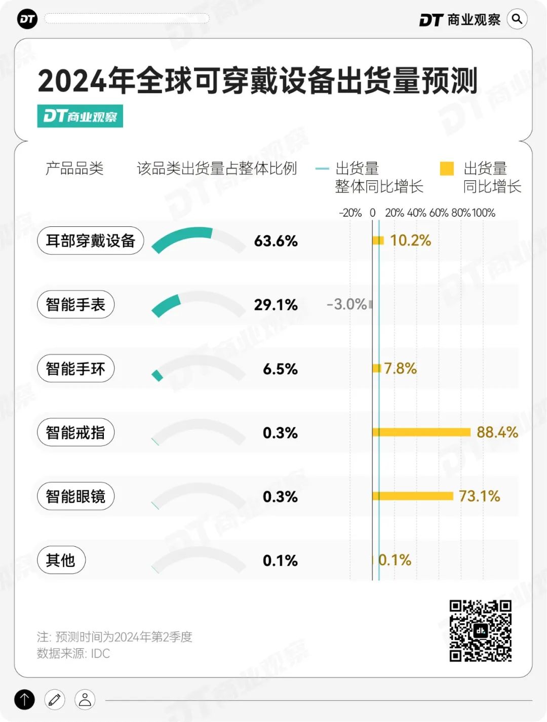 根據IDC在2024年中旬的預測,2024年全球智能戒指出貨量約佔可穿戴設備整體的0.3%,而增速達到88.4%,遠超整體增速6.1%。