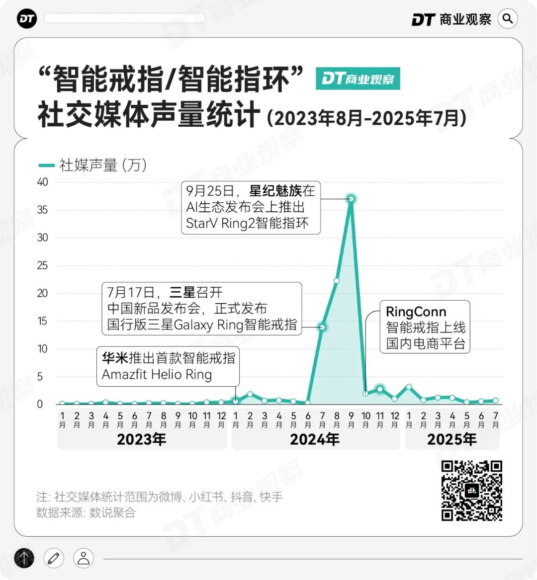 三星的入場像一根導火索,當月“智能戒指 / 智能指環” 在國內社交媒體的聲量陡然增高,並在8月和9月持續攀升。