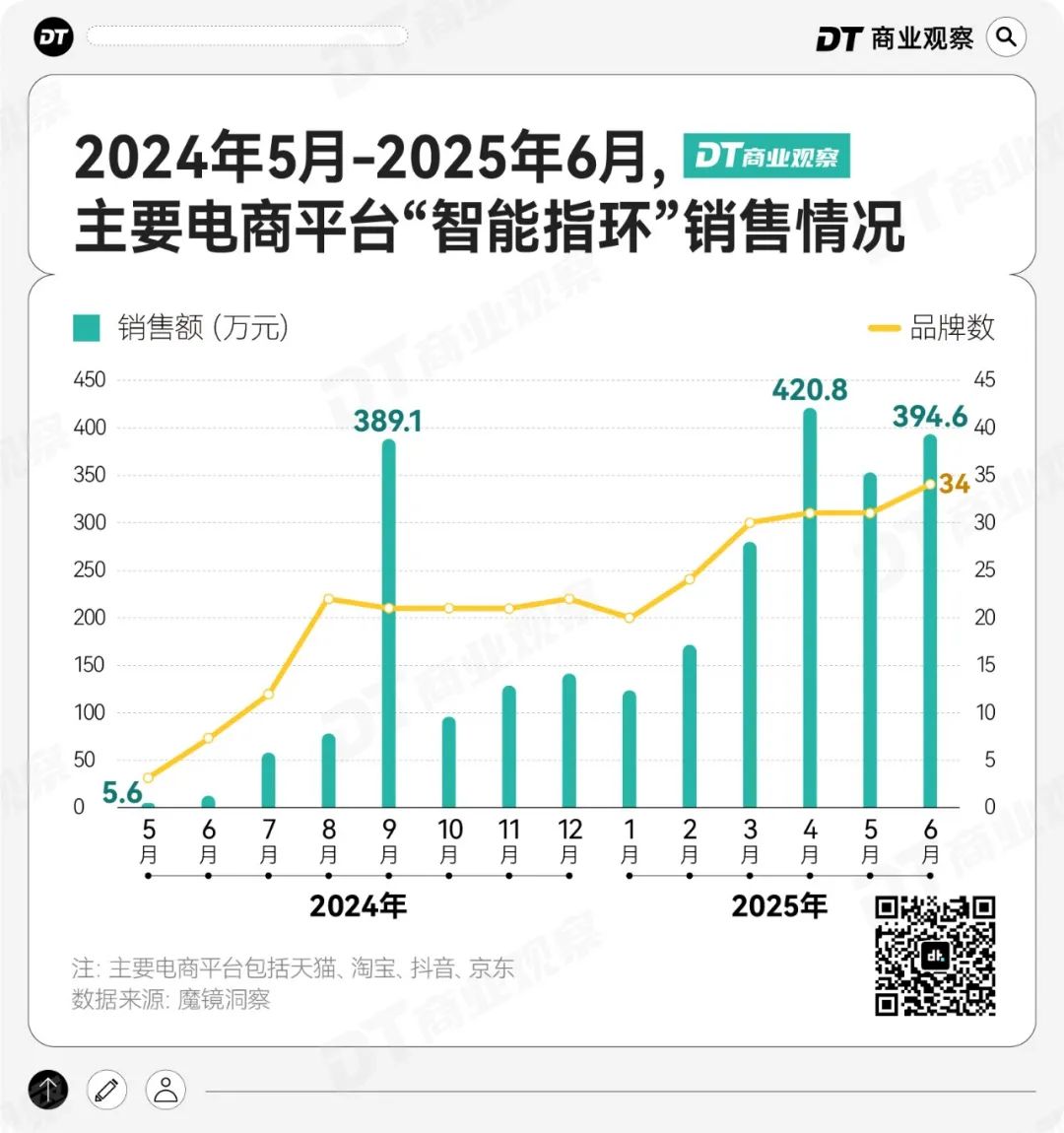 2024年5月,主要電商平台只有3個品牌的智能指環在售,整體銷售額(包括品牌商品和白牌商品)僅5萬多,到2025年6月,智能指環品牌數量達34個,月銷售額超394萬元。