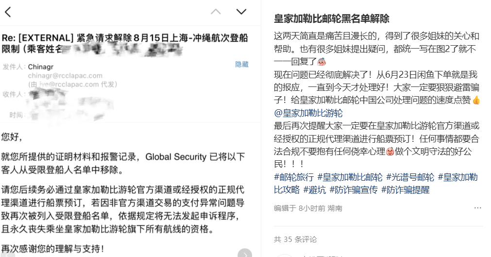雖然她在第一時間就警覺,聯繫郵輪公司並主動取消了票,但系統還是在臨近出發前直接把他拉入了黑名單,禁止登船。