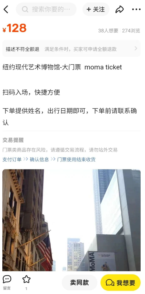 和朋友聊完,我又打開閒魚,找了個紐約MOMA博物館的門票賣家隨便聊了幾句,果然還是熟悉的灰產味道。