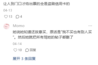 妹子後怕地説,當時四五個工作人員圍着,差點給她倆拉黑名單,最終她們只好在官方App上重新購票,事後才知道買到了信用卡盜刷票。