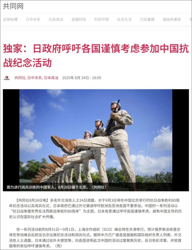據日本共同社報道,多名外交消息人士在8月24日透露,對於中國的九三大閲兵,日本政府現在正在通過外交渠道呼籲歐亞各國不要去中國,不要給中國捧場,稱中國這一系列活動以“抗日戰爭暨世界反法西斯戰爭勝利80週年”為主題,日本政府呼籲各國謹慎考慮,避免中國主導的歷史認知在國際社會擴大傳播。