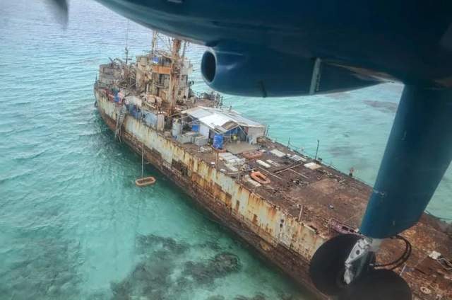 菲律賓非法“座灘”仁愛礁的“馬德雷山號”(57 號艦)已經 26 年了,據公開消息已經有 100 多天沒有運送補給了,可能出於“斷糧狀態”,所以最近才三番五次地開始活動,甚至準備衝闖進行強行補給。
