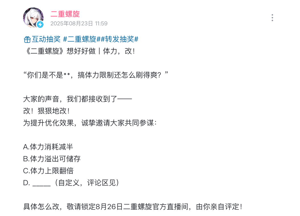玩家也基本秉持開窗理論——如果想要別人給你開窗,那就應該訴求拆掉屋頂——堅決呼籲取消抽卡,刪除體力。可以明顯感覺到玩家對此基本並不抱希望,語氣也近似於調侃,更多是希望以此表示出態度,併力所能及爭取廠商的更多讓步。只是沒想到,《二重螺旋》虛晃一槍,確實超出預期地把屋頂給掀了。
