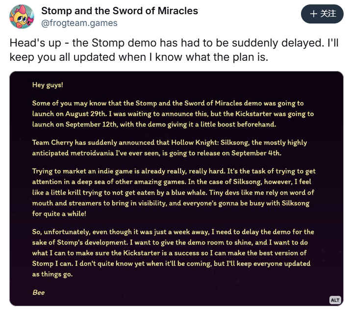 就連一些尚未進入發售階段的遊戲,也因為《絲之歌》的突然到來顯得大為苦惱:《Stomp and the Sword of Miracles》原本計劃在8月底開啓眾籌、9月初發布試玩Demo,如今因為《絲之歌》發售,宣佈了推遲眾籌時間。