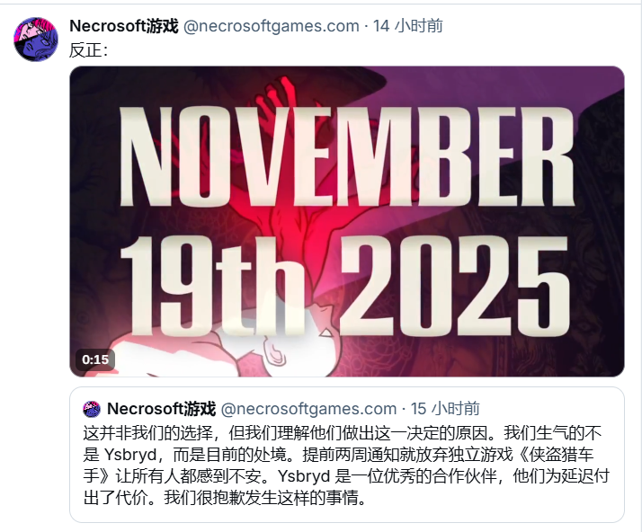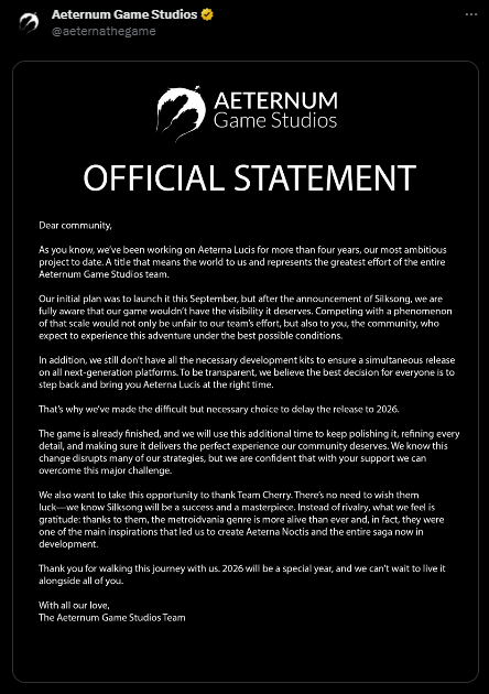 比如原計劃9月發售的《Aeterna Lucis》,在《絲之歌》公佈發售日當天,便在推特上發表了聲明,宣佈將一路推遲至2026年發售,部分原因是“為了避免受到《絲之歌》影響”。
