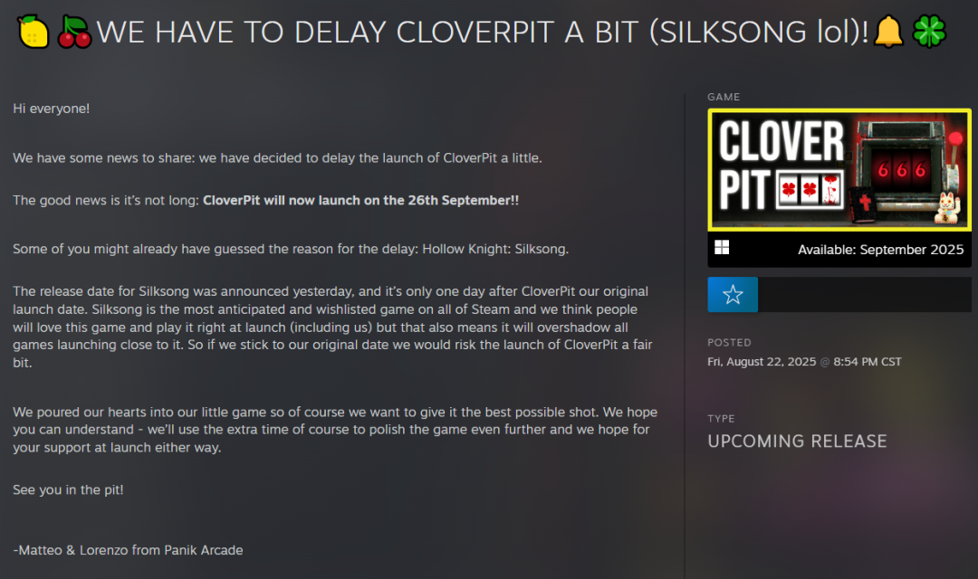 除了銀河惡魔城遊戲,也有一些其他類型的遊戲選擇了躲避《絲之歌》的鋒芒:“小丑牌Like”遊戲《CloverPit》,原本計劃在9月3日發售,如今推遲到了9月26日。