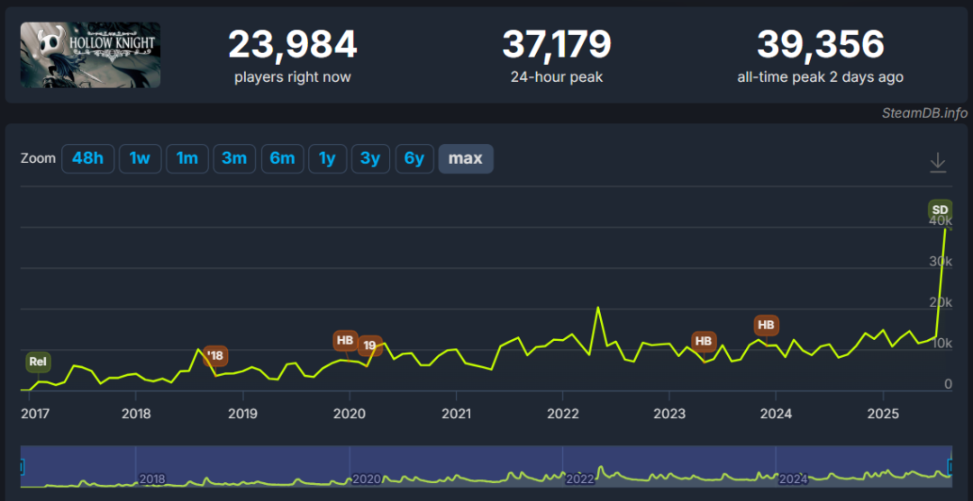 這個消息點燃了全球玩家的熱情,《空洞騎士》時隔多年再次刷新歷史最高同時在線人數紀錄,當日峯值人數來到了3.9萬。
