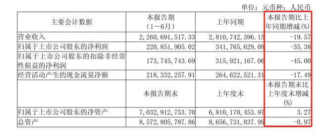 上半年,華熙生物營收僅22.61億元,較去年同期的28.11億元大幅縮水近6億元;歸母淨利潤2.21億元,較去年同期的3.42億元少賺1.21億元,降幅超三成。