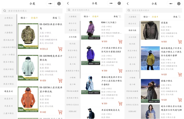 在價格與銷量一併水漲船高的情況下,聞利而來的平替廠商坐不住了。於是,在“台州鳥”遍地走後,“台州石”成為下一個平替炸子雞,在一個個社交種草、短視頻、閒置物品交易平台上氾濫開來。通過引渡小程序鏈接或電商平台直接交易,一件件僅需原售價1/10的衝鋒衣瞬間被消費者收入囊中。