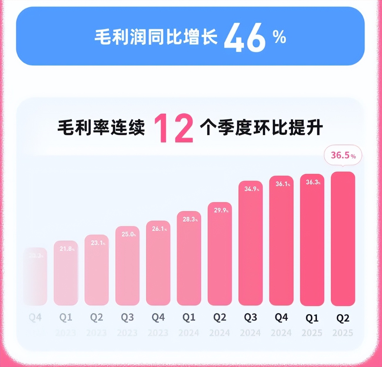 更關鍵的是,得益於AI技術對流程賦能,二季度其毛利率從去年同期的29.9%大幅提升至36.5%,且這已是其連續12個季度環比提升,對應毛利潤同比增長46%,顯示其經營質量的顯著優化。