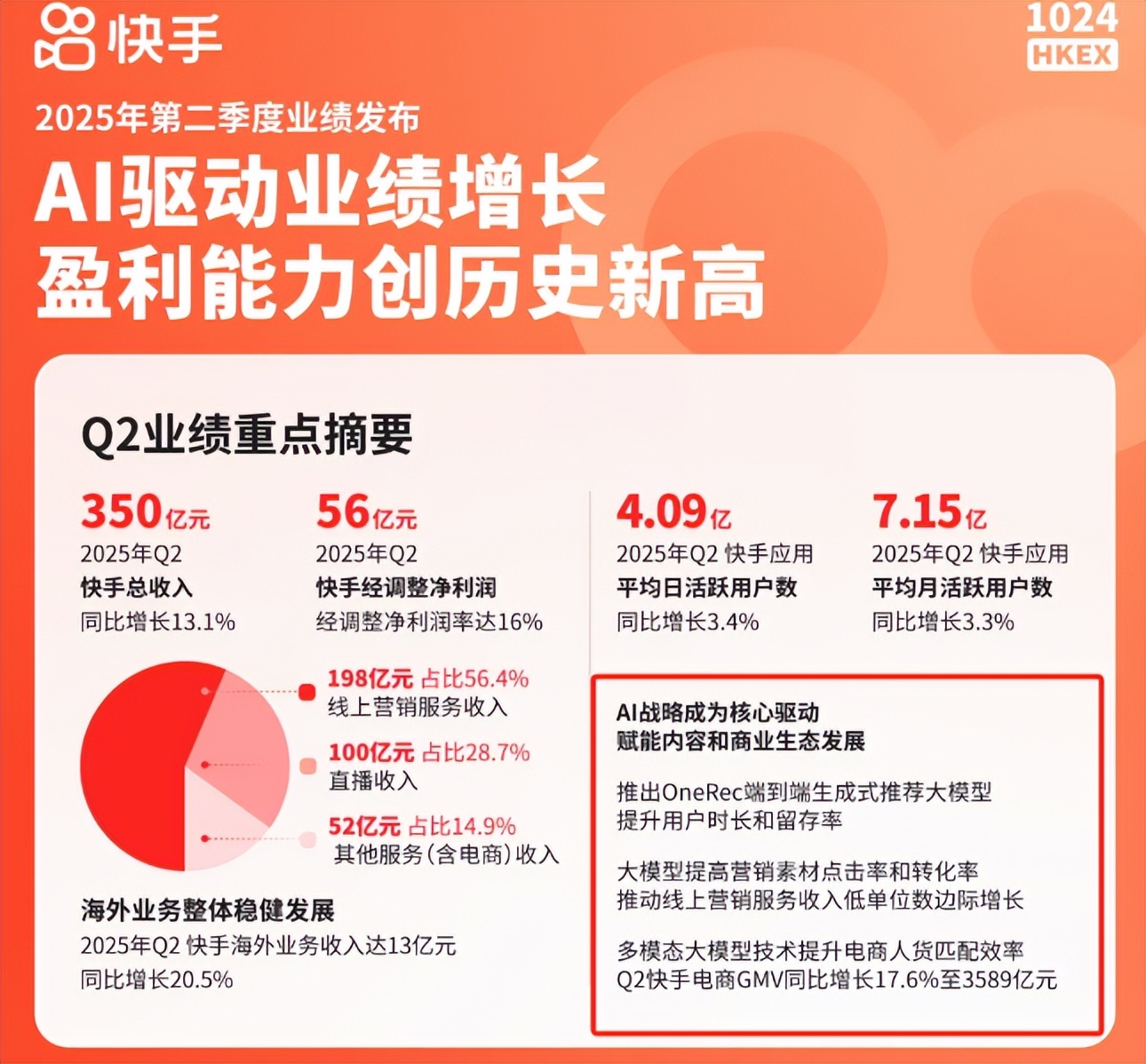 8月21日,快手發佈2025年二季度財報,總營收同比增長13.1%至350億元,經調整淨利潤56.2億元,同比增長20.1%,營收、利潤均遠超彭博一致預期。